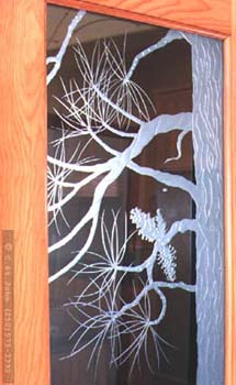 These deeply carved sandblast etched french doors (10mm (3/8") thick glass) carry the theme of the wilderness safely inside.